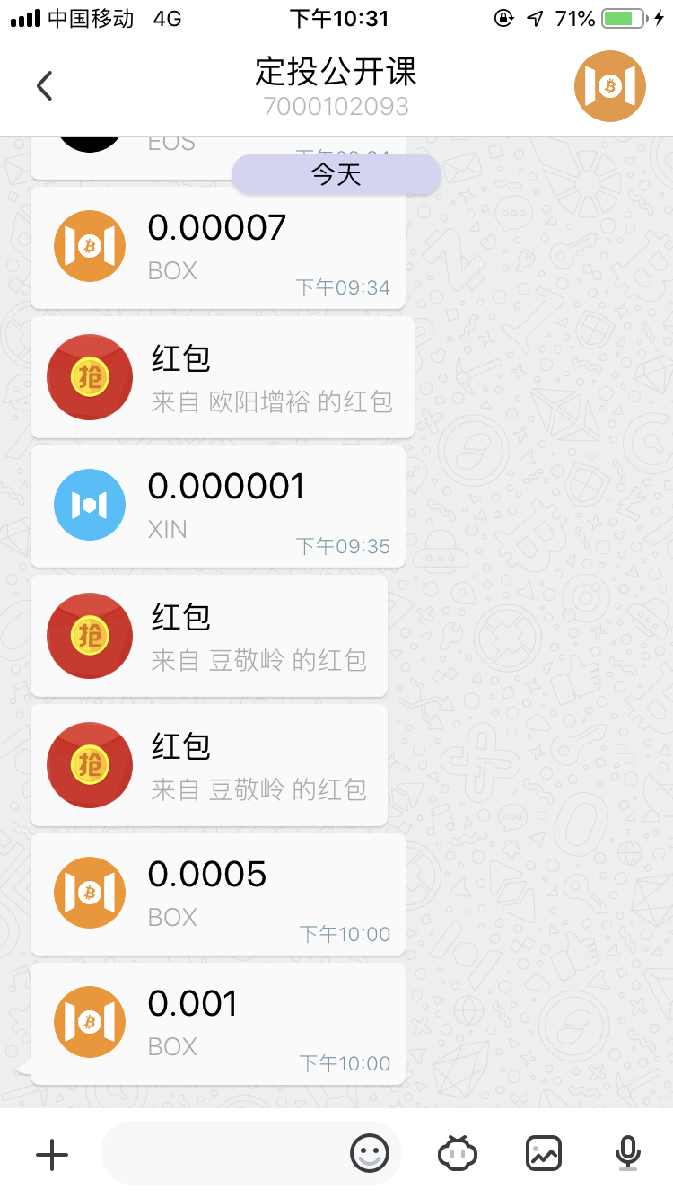 因为 Mixin Messenger 本身就是一个聊天工具,那当然少不了社交功能。其中 定投公开课群(ID:7000102093) 就是一个难得免费投资课堂,不定期的有很多红包: